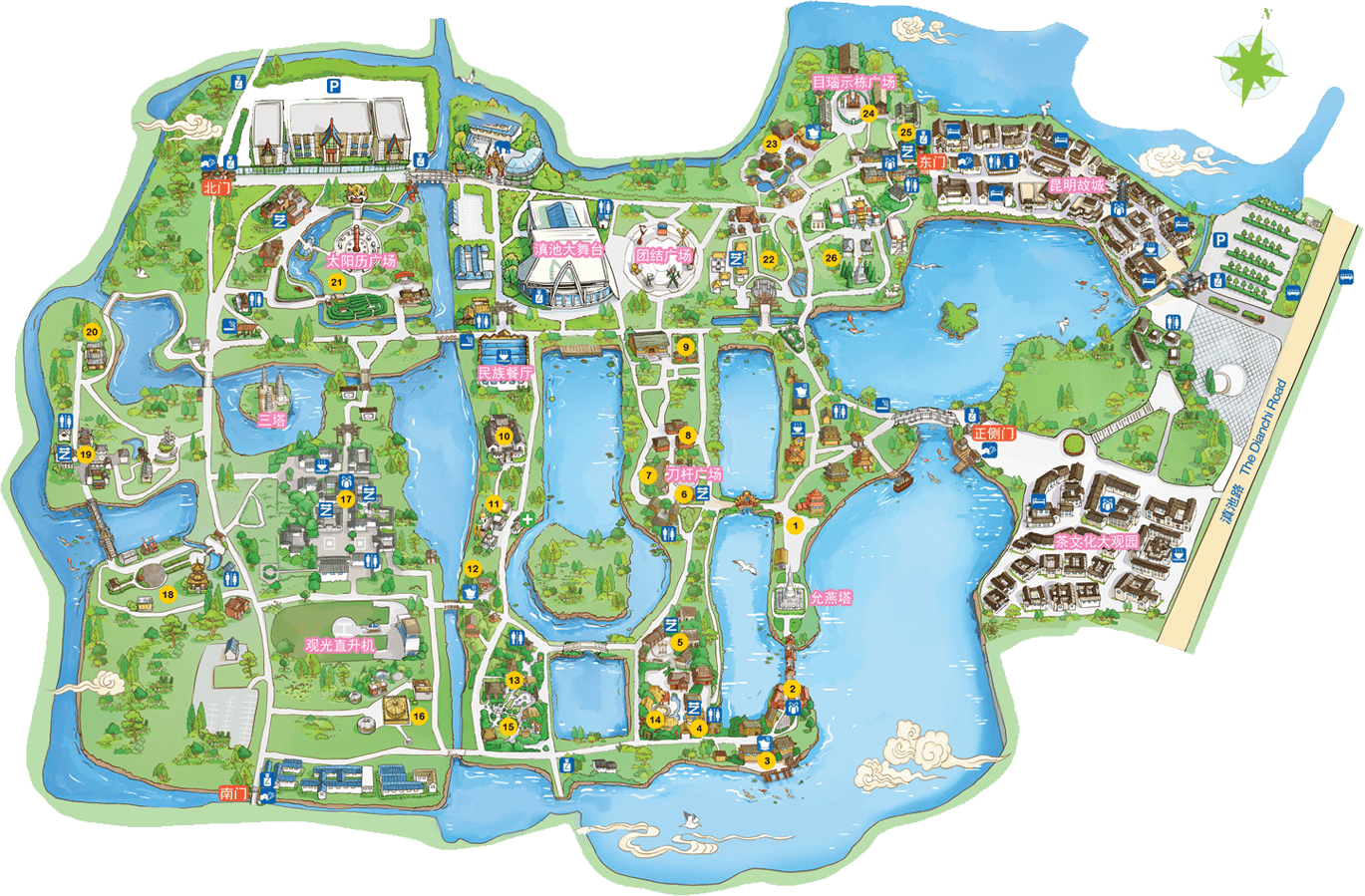 彝族在云南境內約471萬人,是省內人口最多、分布最廣的少數民族,主要聚居在金沙江、元江流域和哀牢山、無量山腹地。彝族是一個能歌善舞的民族,民間打歌、跳樂之風盛行,大三弦、跌腳舞久負盛名。火把節是彝族最具特色的民族節日。彝族村占地50余畝,三虎浮雕墻與虎頭內祖師形象表現了彝族虎鷹文化。太陽歷廣場圖騰柱上有太陽、虎、火和八卦圖形象,周圍環繞著10個朝向不同的月球造型,外圓周有12生肖石雕。依山而建的“...